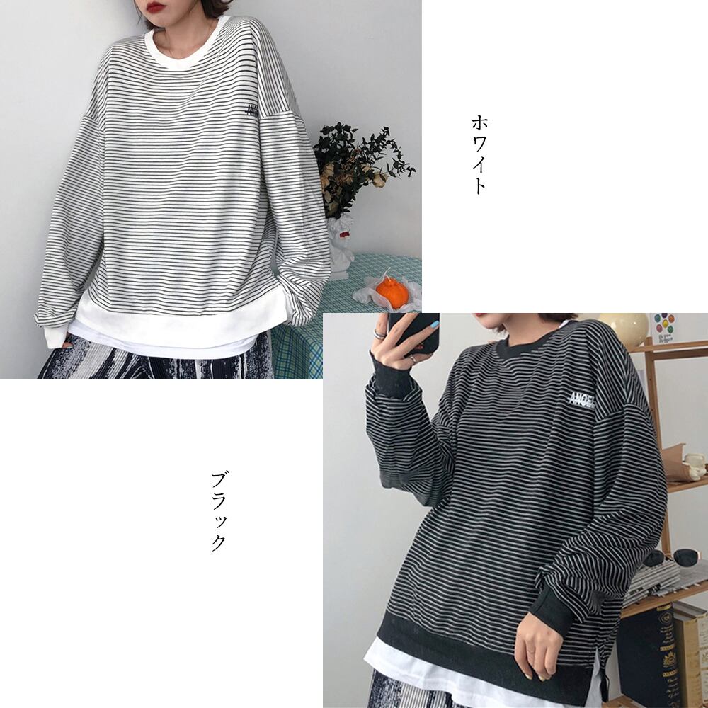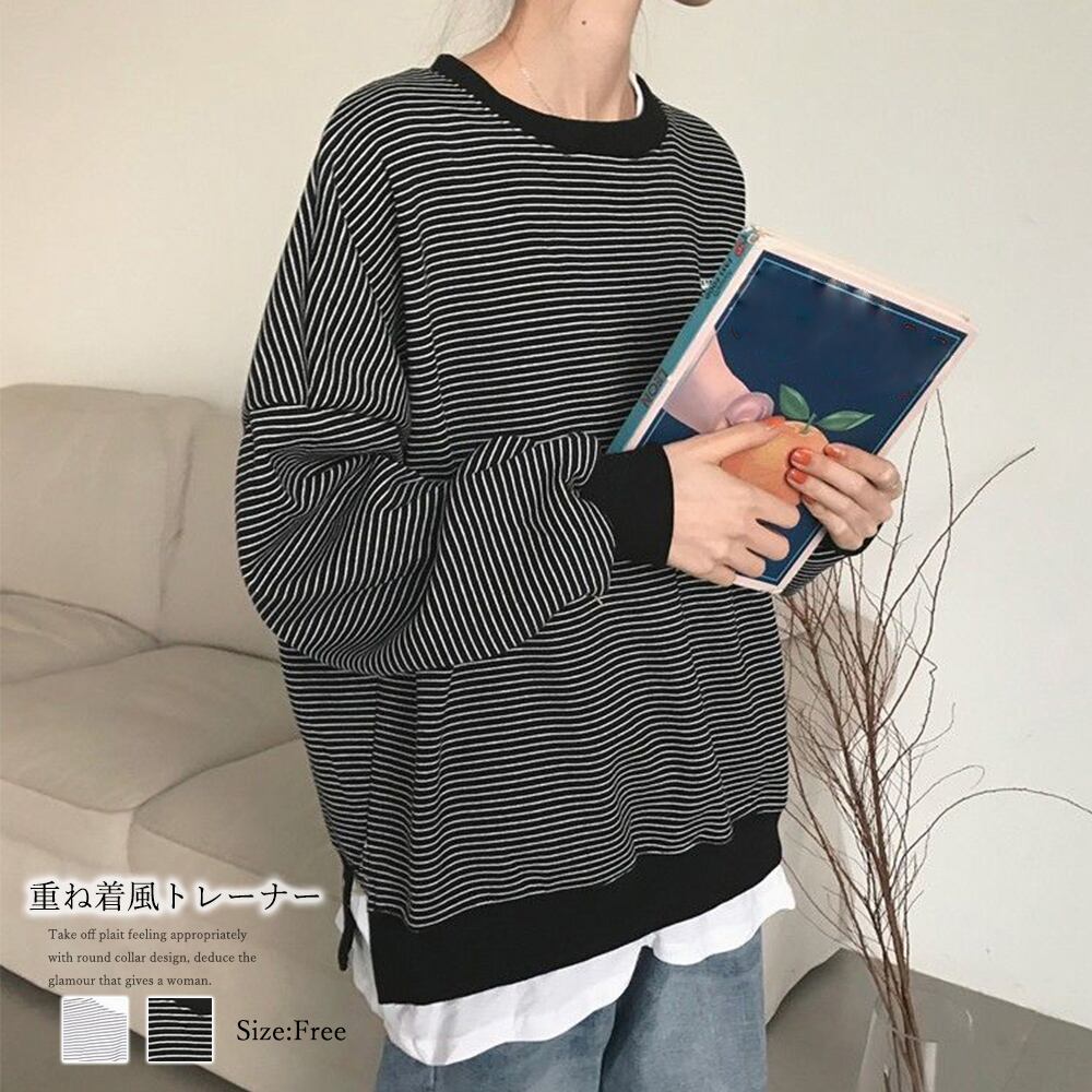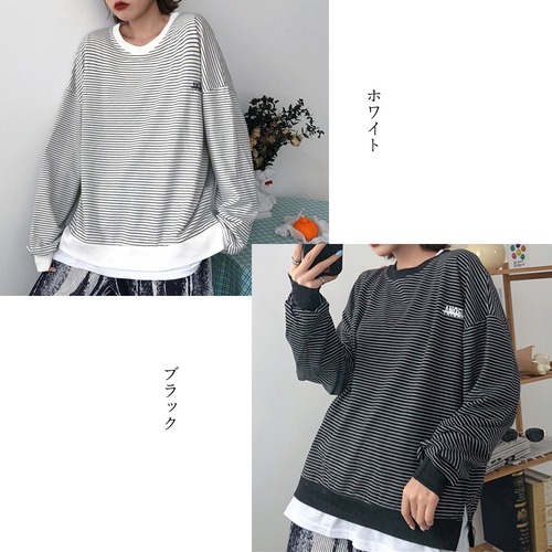 ラウンドネック レイヤード風 プルオーバー 長袖 重ね着風 ゆったり 体型カバー