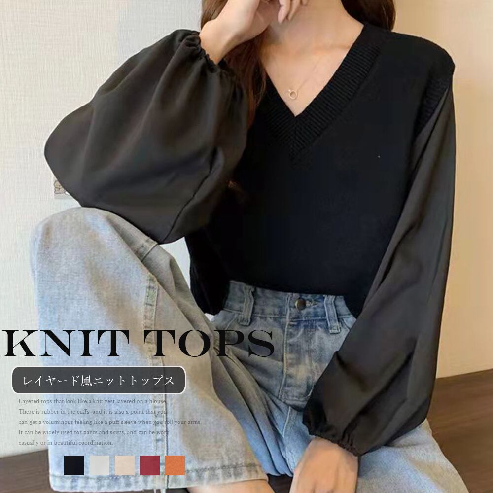 【日本倉庫即納】 ニットトップス レイヤード風 異素材