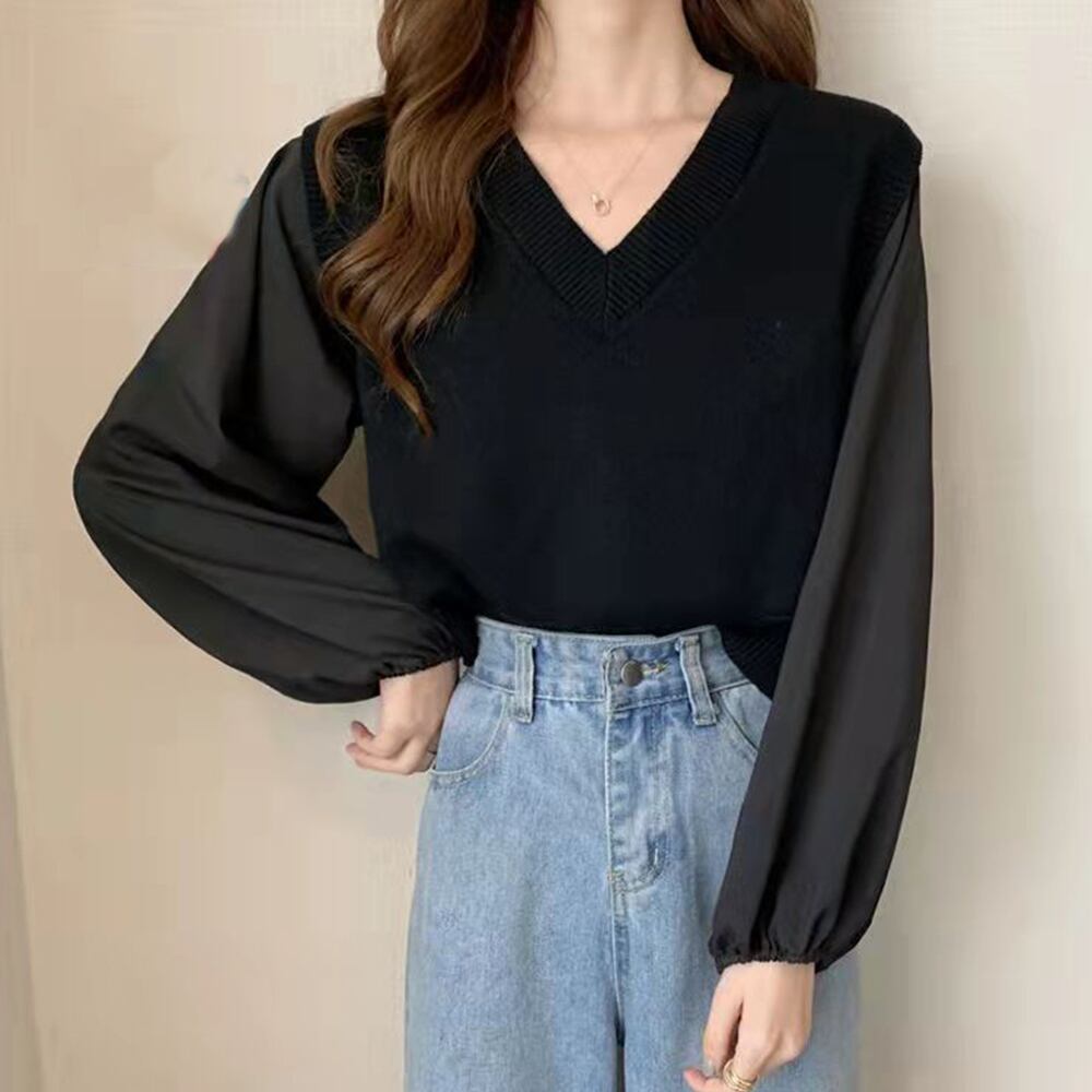 袖切替 トップス 着やせ ブラウス 韓国風 ニットソー