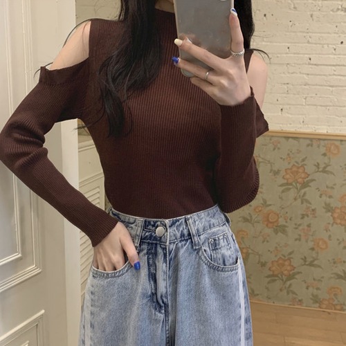 【日本倉庫即納】 リブニットトップス 肩だし ハイネック