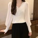 ニットソー 異素材切替 Vネック トップス カジュアル ボタン飾り リブニット 春秋コーデ 長袖 きれいめ