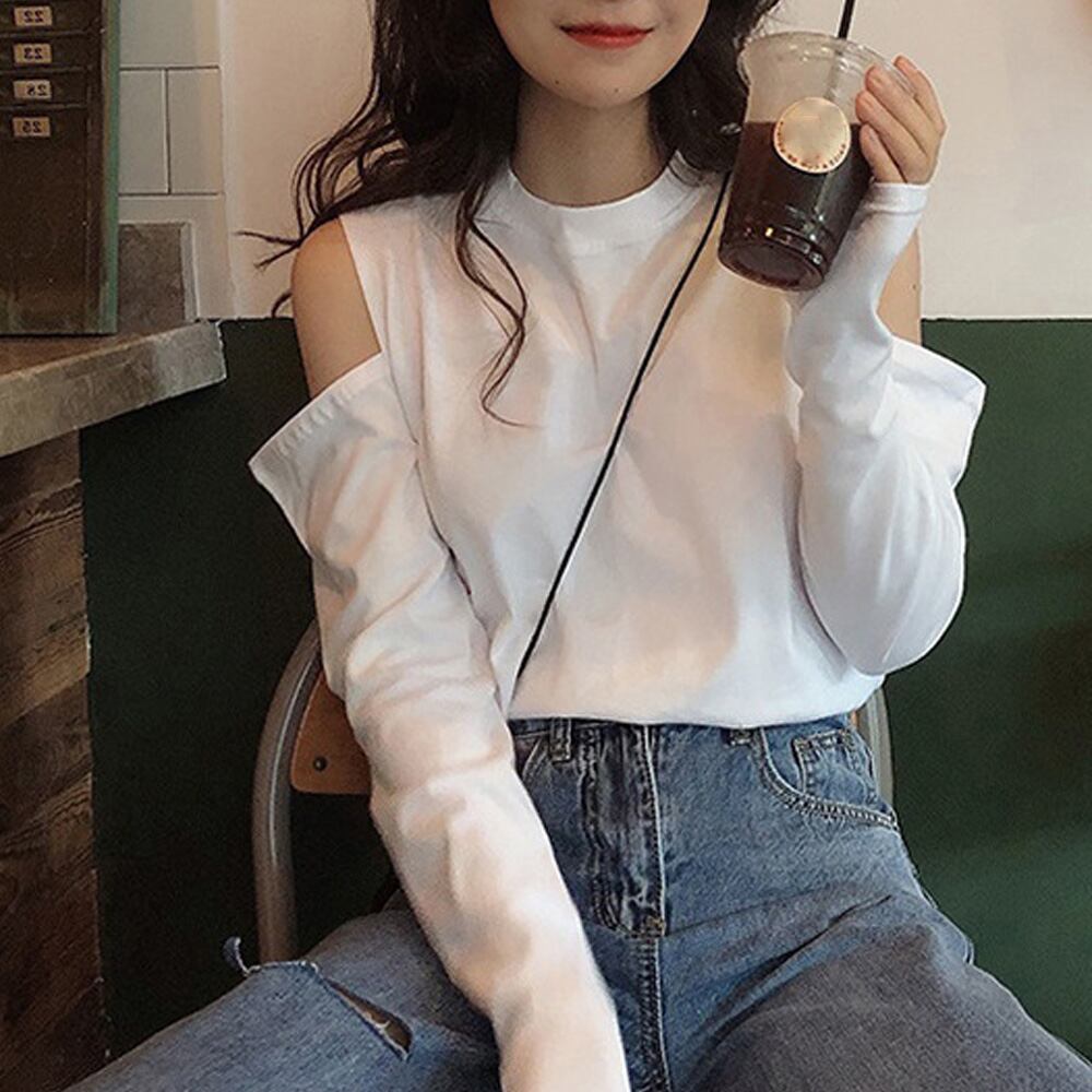 肩開きデザインがセクシーで女性らしい長袖Tシャツ