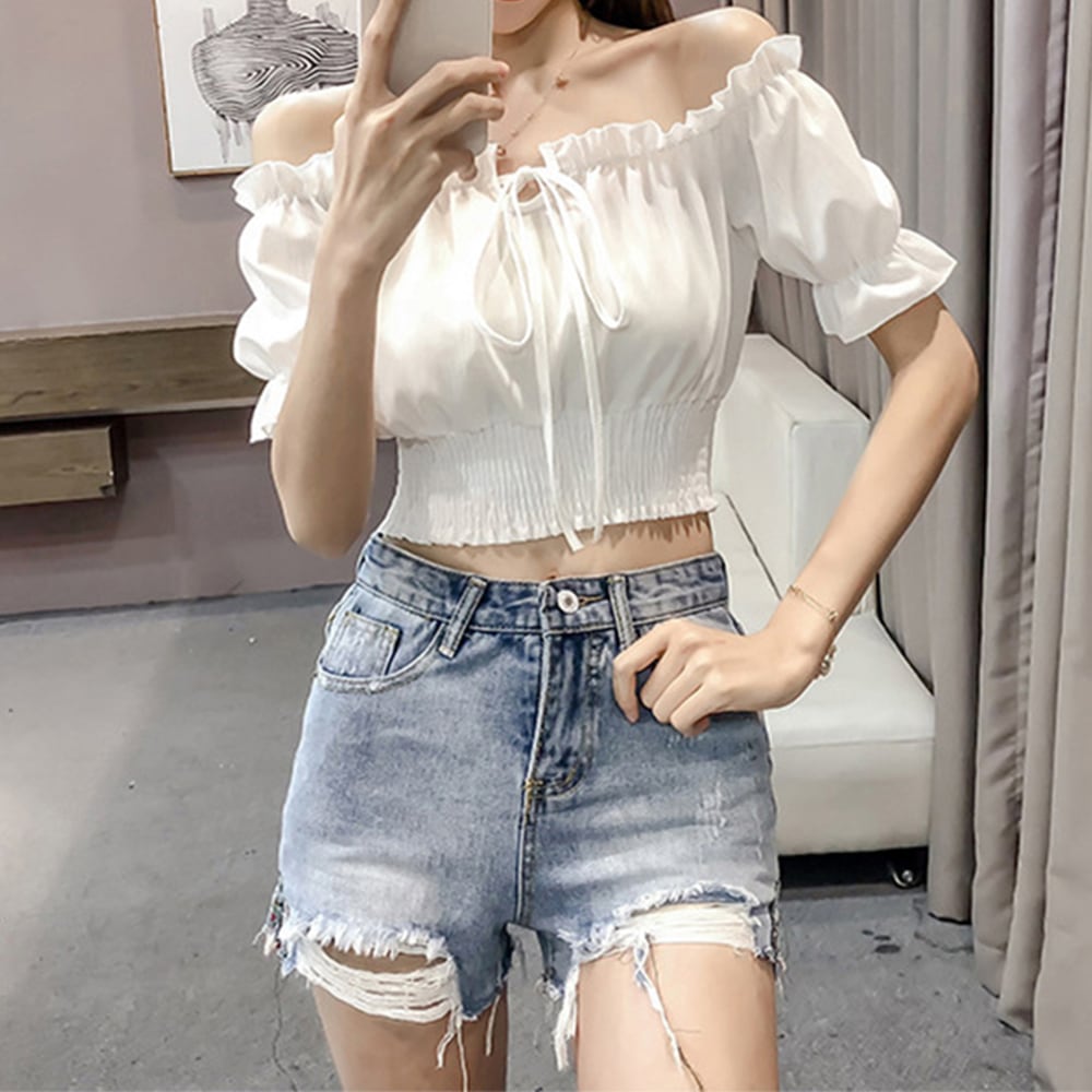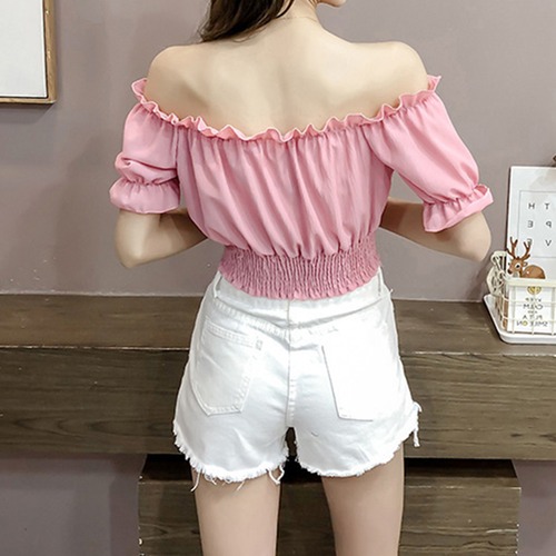 ブラウス パフスリーブ シャツ ショート丈 トップス 半袖 肩出し おしゃれ セクシー デコルテ