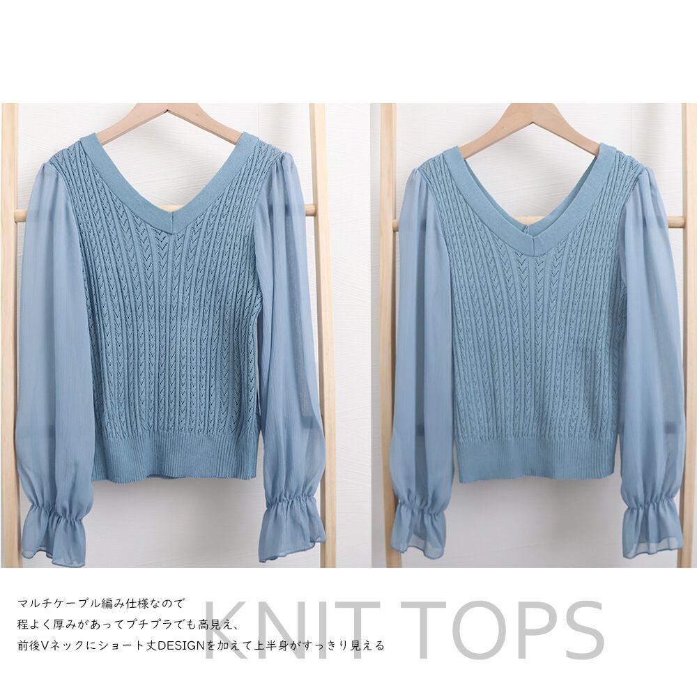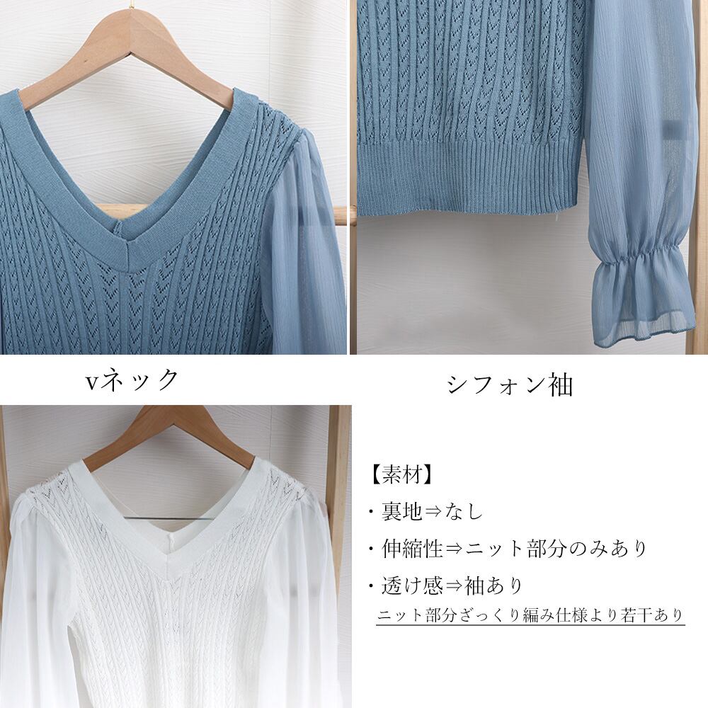vネック ニットソー ぽわん袖 シースルー シフォン袖 異素材切替 トップス きれいめ ケーブル編み セーター 大人 女子
