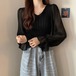 シアー素材のキャンディスリーブが女性らしさを際立たせる切り替えニットトップス