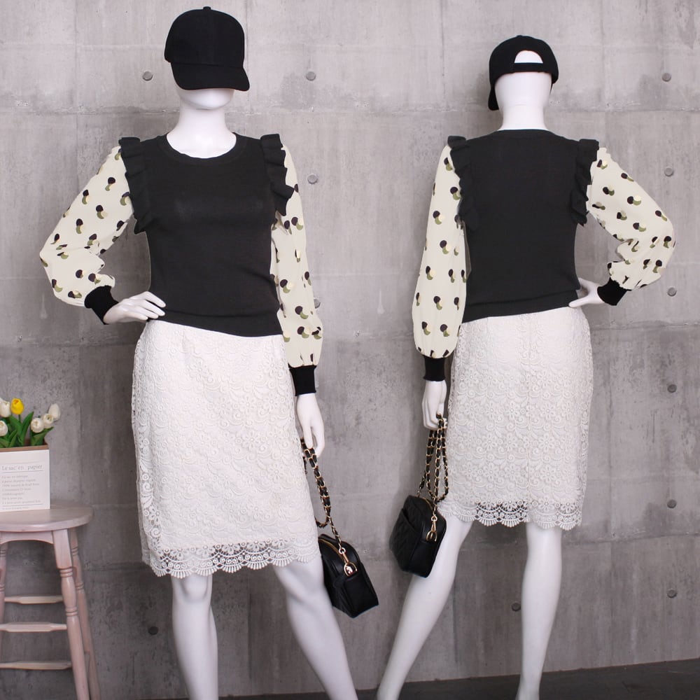 ブラウス ドッキングニット 長袖 袖切り替え レイヤード風 ショルダーフリル おしゃれ ニットソー フェミニン 可愛い
