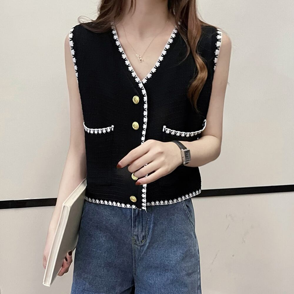 ショート丈トップス 前開き ノースリーブ ボタン付き 重ね着 通勤 ベスト 学院風