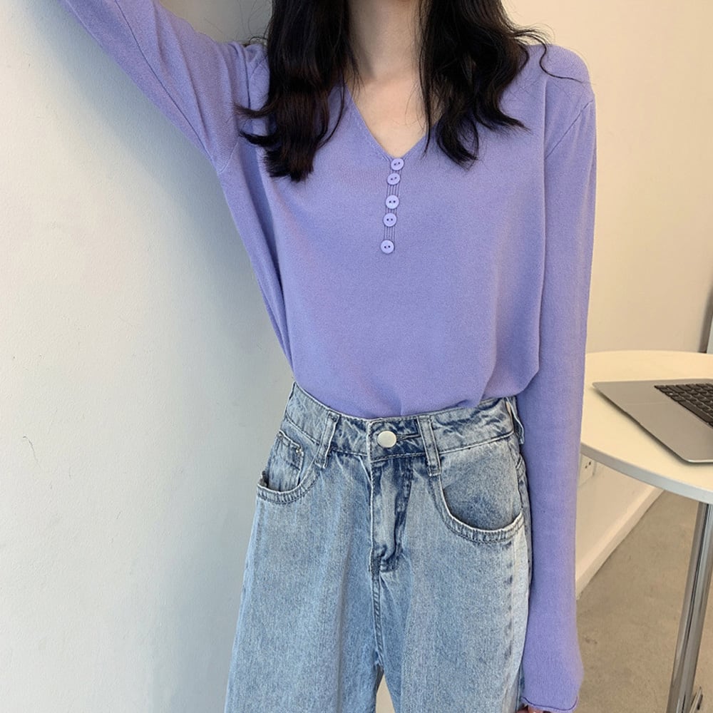 フロントにボタンをあしらった、大人カジュアルなVネックニットトップス