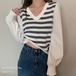 【日本倉庫即納】 袖切り替えボーダーニットトップス