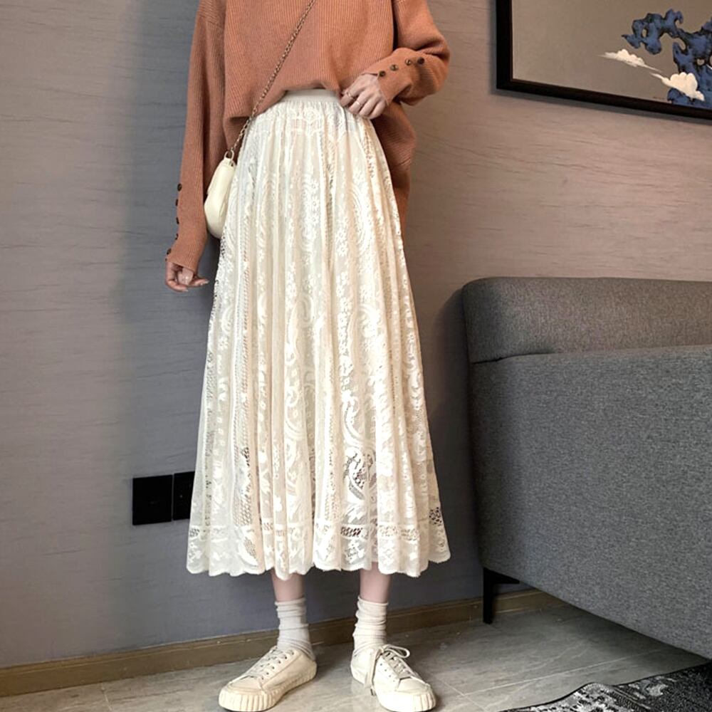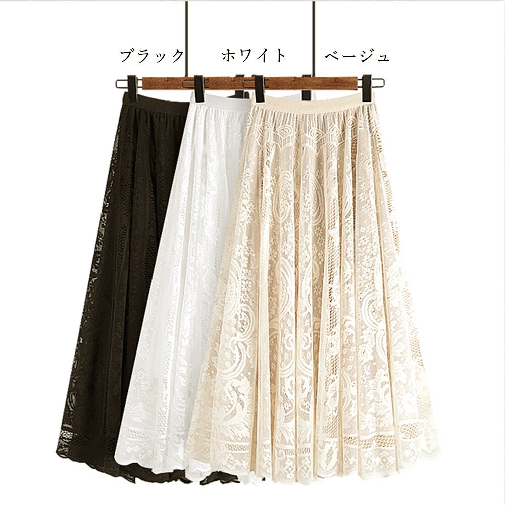 フレアスカート ウエストゴム シースルースカート 裏地付き エレガント ミモレスカート 韓国 フラワーレース お洒落