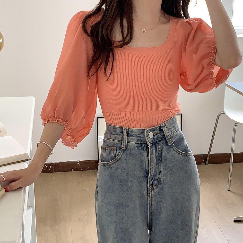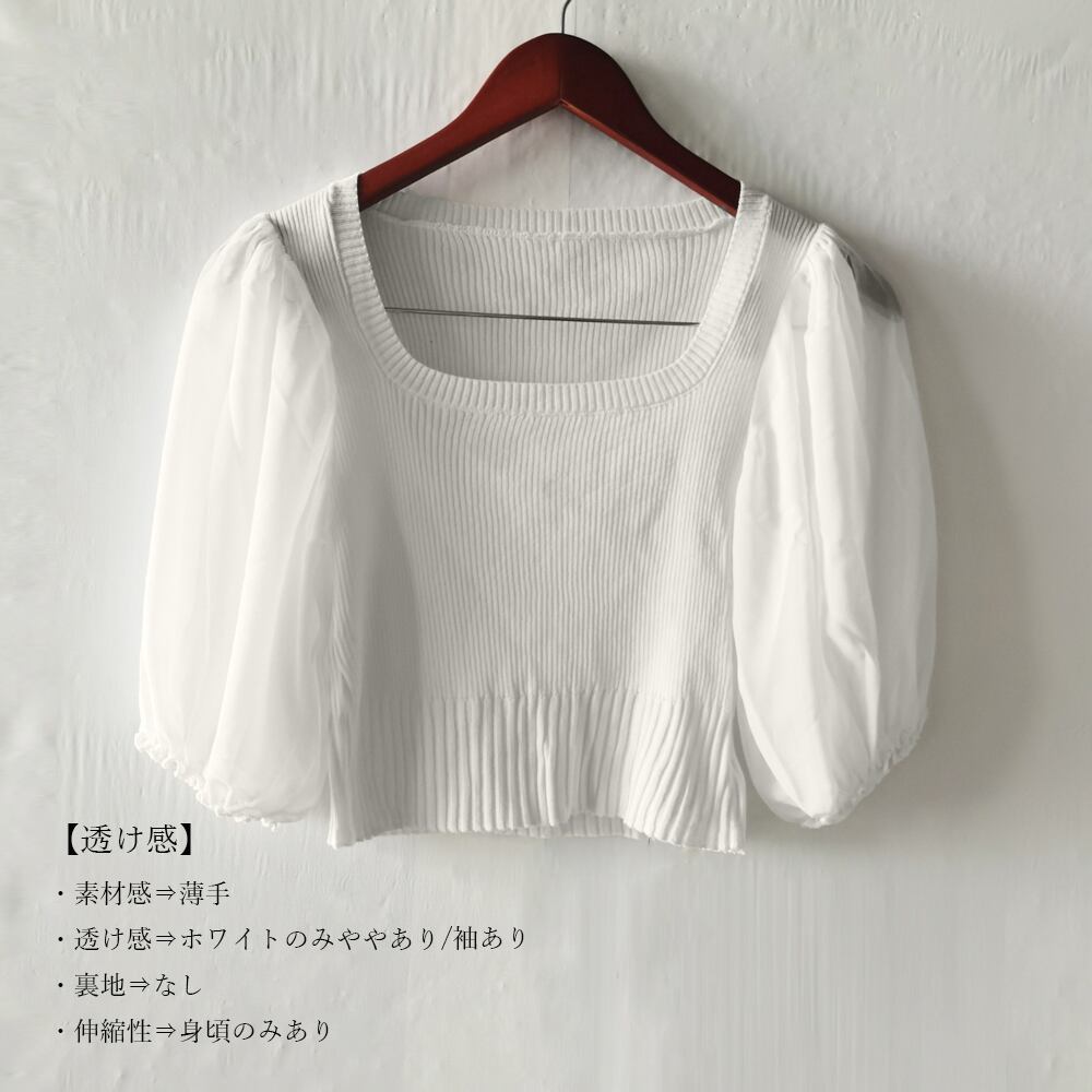 レディース スクエアネック ニットブラウス 異素材 パフスリーブ シャツトップス お洒落 フェミニン