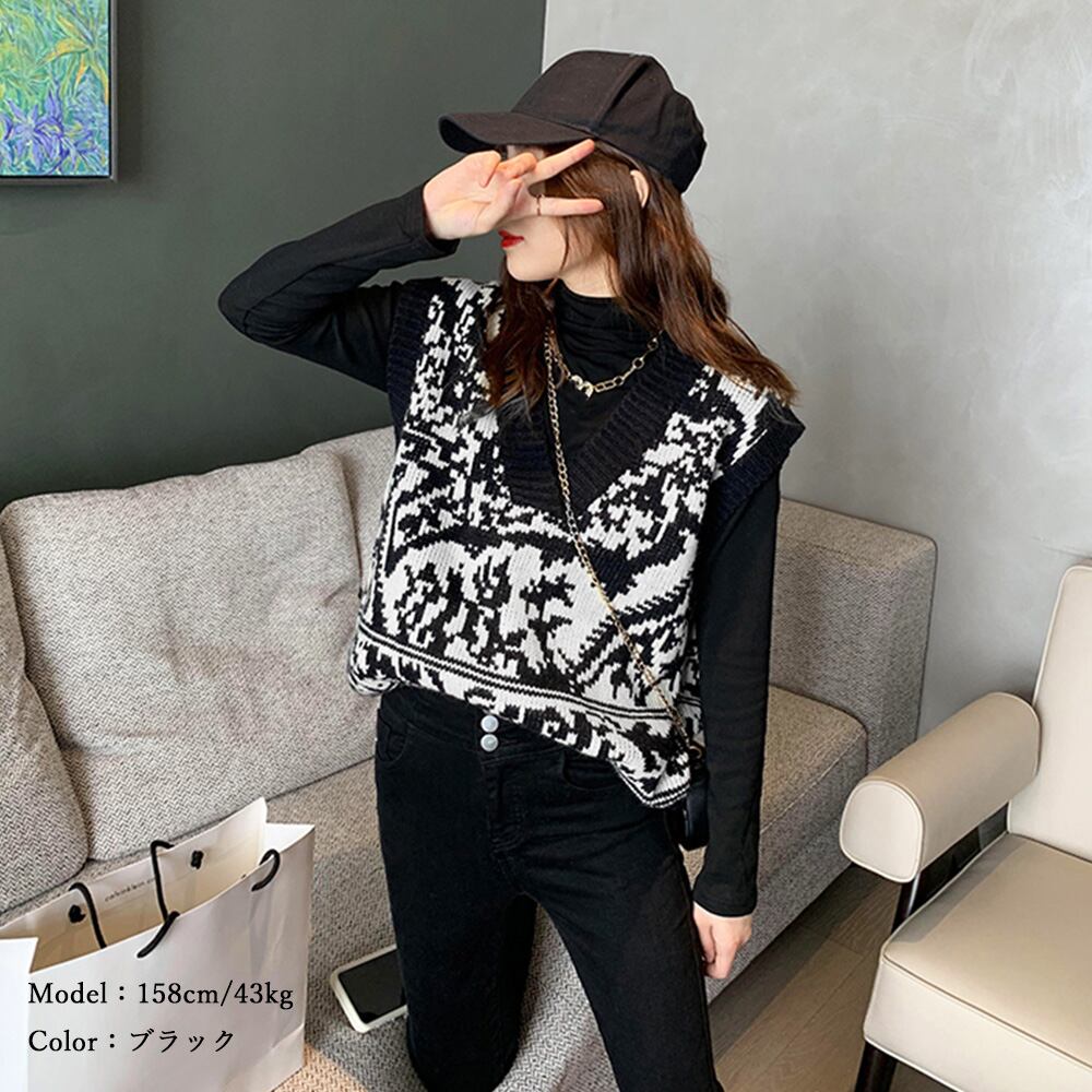 柄 ジレベスト 黒 ノースリーブ トップス 重ね着 プルオーバー チョッキ 人気 無地 配色ニット オフィス 通勤 学院風