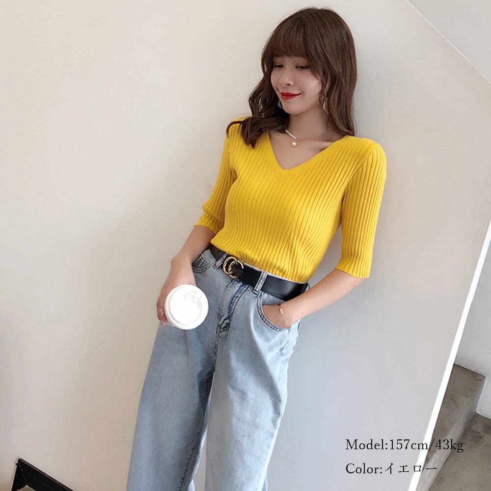 【日本倉庫即納】 リブ編みニットトップス Vネック 半袖