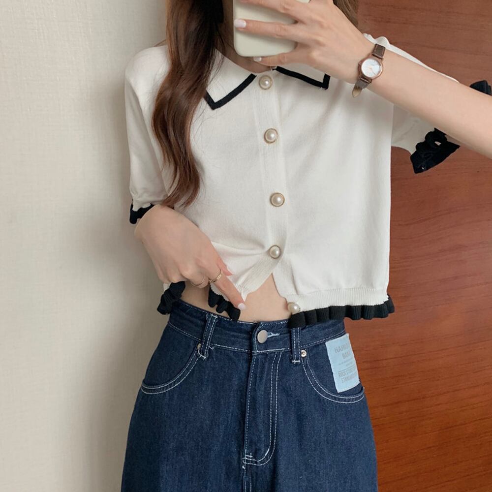 ニットソー 薄手 ボダン付き トップス 半袖 オフィス ショート丈 大人可愛い フリル プルオーバー 羽織