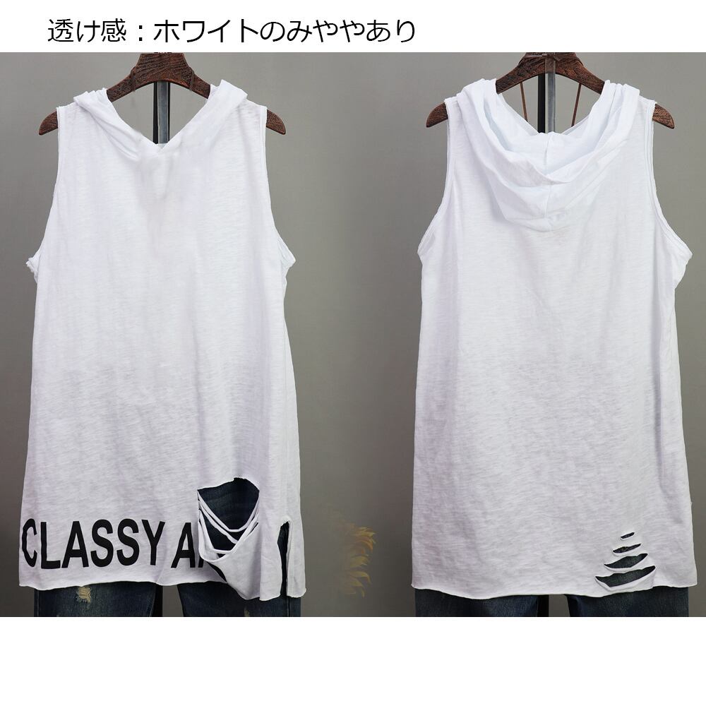 レディース 夏サマー ダメージ付き ノースリーブ 体型カバー ロゴプリント