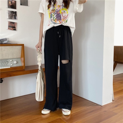 韓国 穴あき スエットロングパンツ ウエストゴム イージーパンツ カジュアル リラックス ストレートパンツ 着やせ