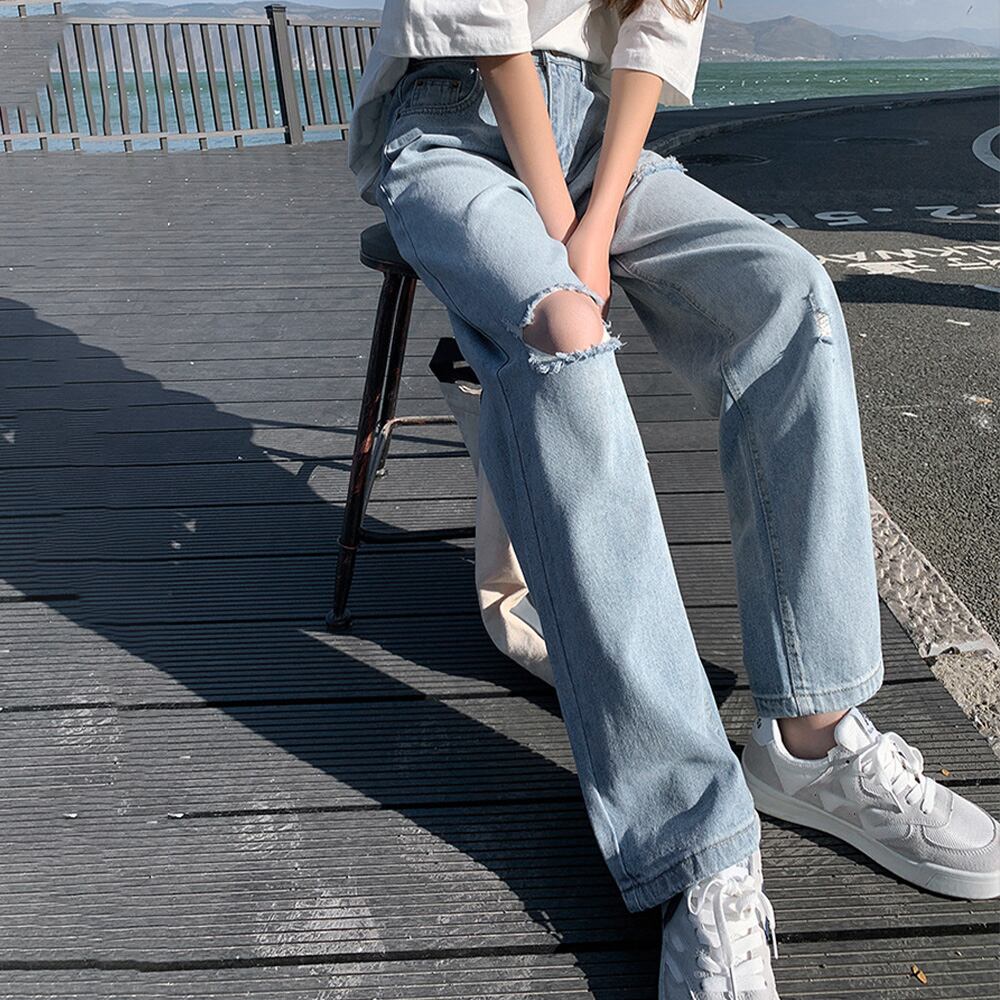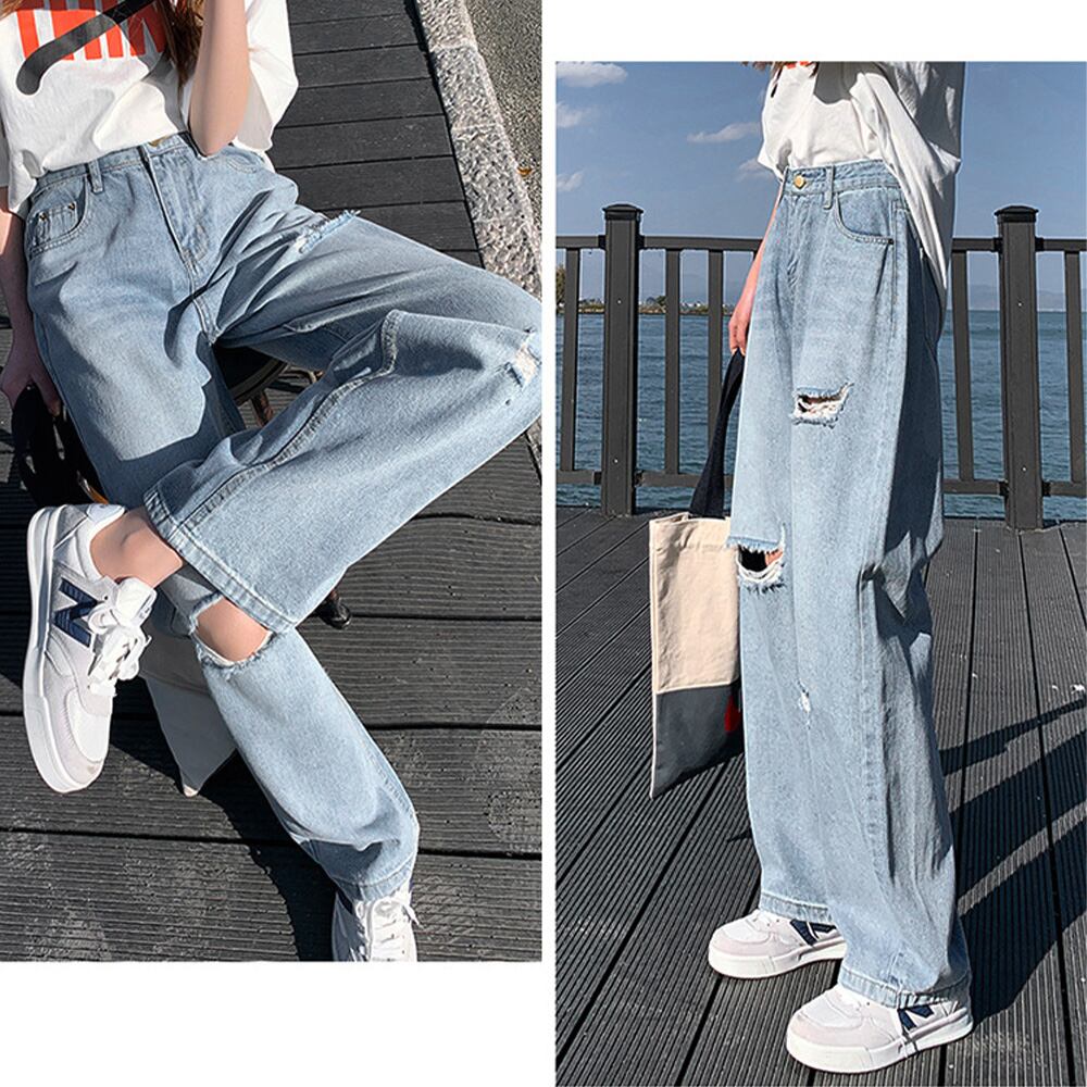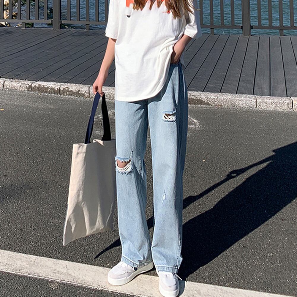 【日本倉庫即納】 ワイド デニムパンツ ダメージ加工脚長