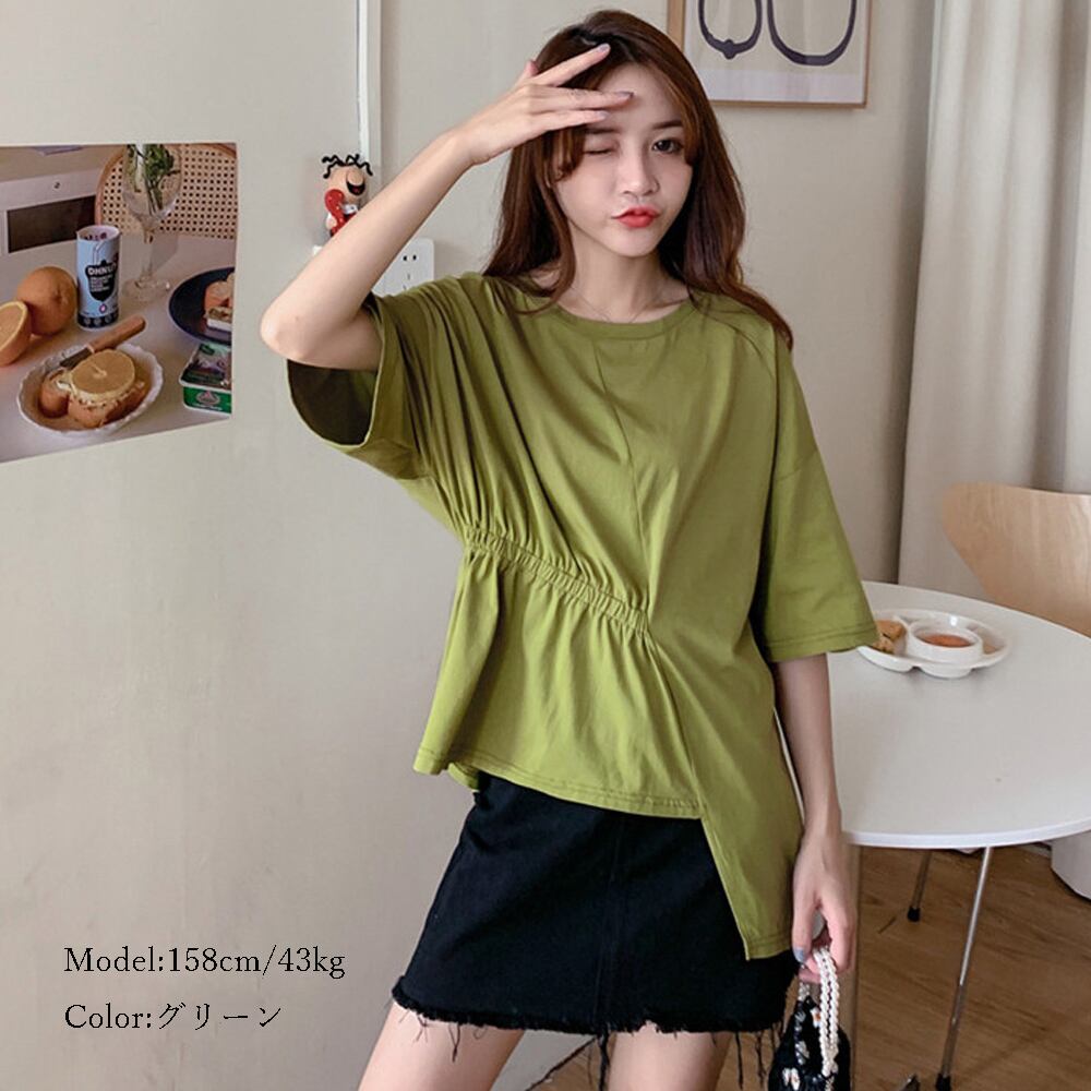 トップス ゆったり アシンメトリー カットソー サイドギャザー クールネック Tシャツ 着やせ トップス 無地 Tシャツ 半袖 カットソー