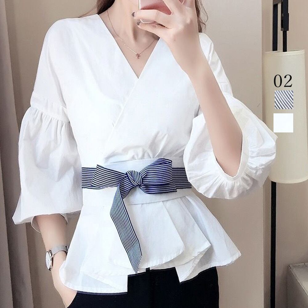 【日本倉庫即納】 シャツブラウス ストライプ パフスリーブ