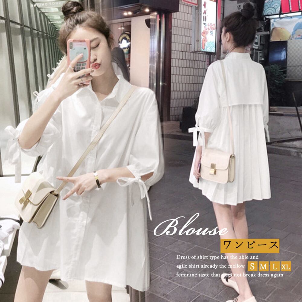 シャツワンピース 膝上丈ワンピース ゆったり 韓国風 大人 新品 ブラウス 白 半袖 おしゃれ ブラウスワンピース