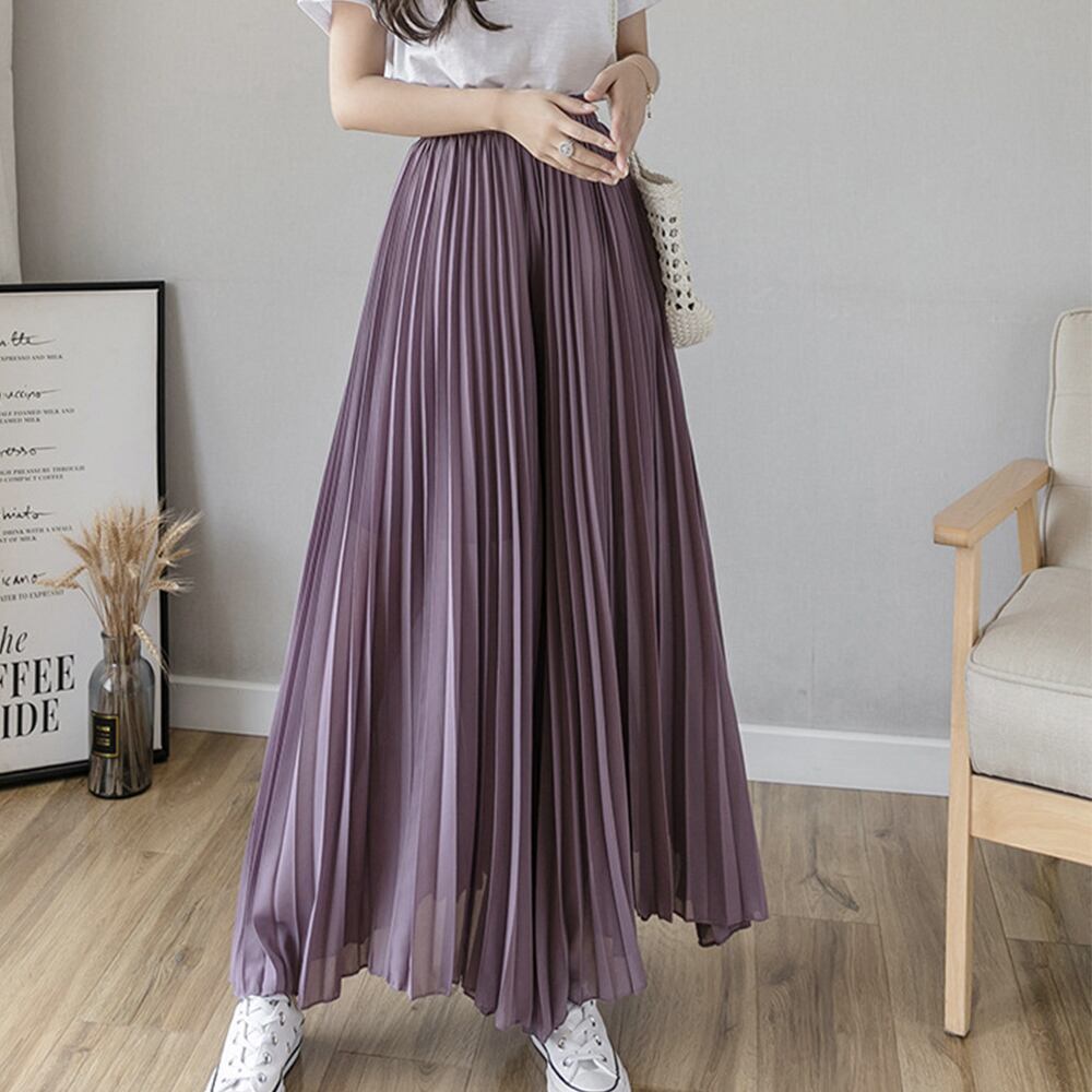 春先から秋まで長く着回せる、薄手のシフォンプリーツワイドパンツ