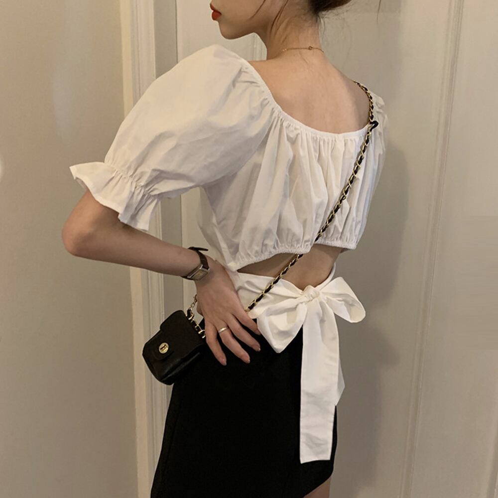 オープンバック仕様にリボン結びデザインがセクシーで可愛い半袖トップス