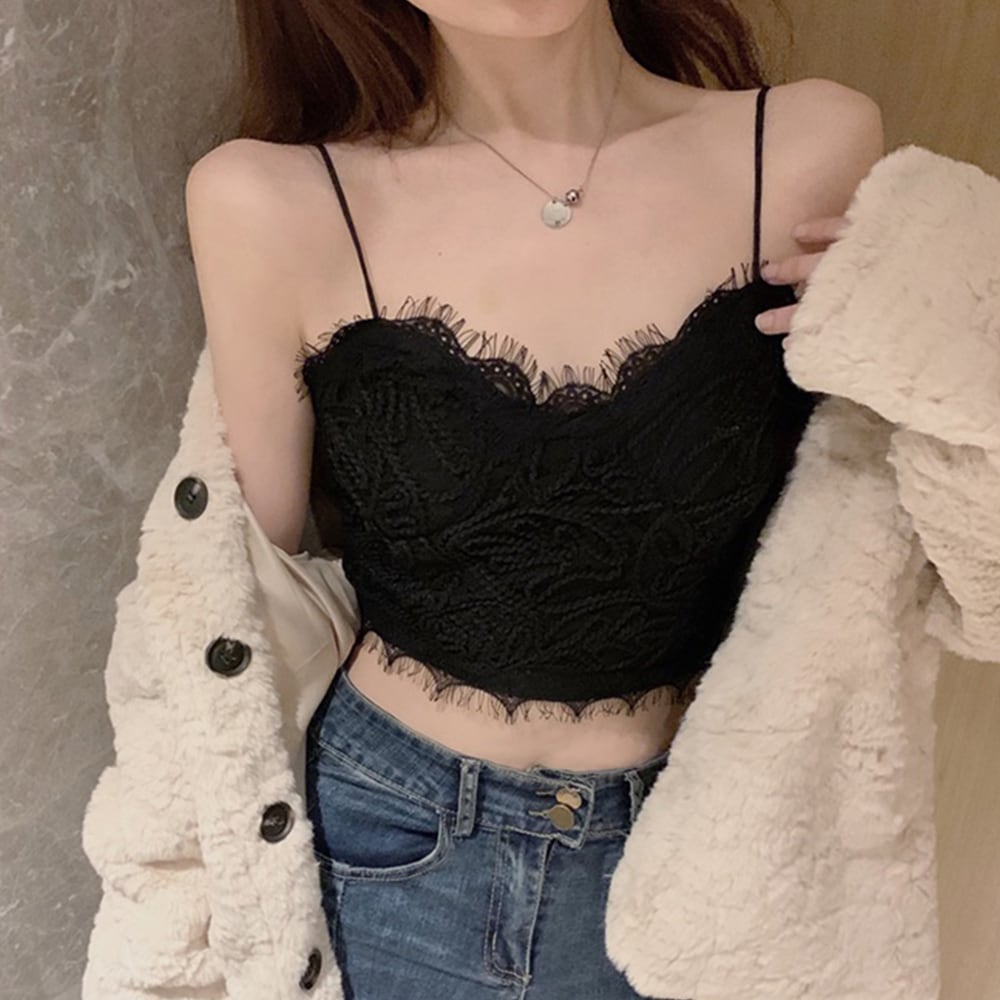 パッド付き 刺しゅう ノースリーブ ショート丈 春夏新作 ブラキャミ ギャザー 肌着 インナー オシャレ 人気 黒 花柄レース 韓国風