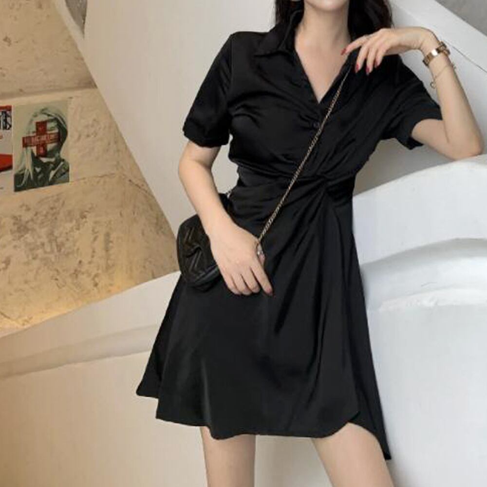 レディース ギャザー 韓国ファッション Aラインワンピース 無地 結婚式 ドレス 黒