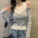 ボタンデザイン ドッキング セーター おしゃれ 韓国ファッション オフショルダー 伸縮性ありきれいめ セクシーカジュアル フェミニン 春秋冬