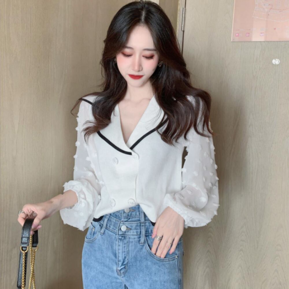 【日本倉庫即納】 ニット切り替え シャツブラウス レディース Vネックシャツ ダブルブレスト