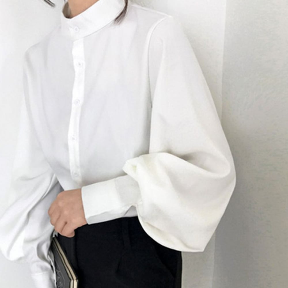 レディース スタンドカラーブラウス ハンドカラー 韓国 ボリューム 長袖シャツ 着やせ 大人カジュアル無地30代40代