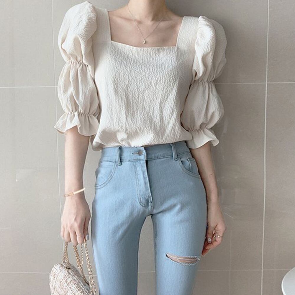 【日本倉庫即納】 ブラウス スクエアネック レディース パフスリーブ ショート丈 トップス