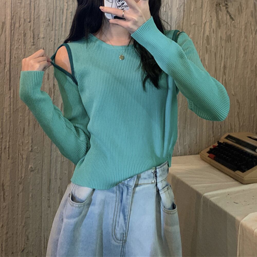 【日本倉庫即納】 リブニットトップス レディース 肩開き ニットセーター 無地 肌見 ニットソー