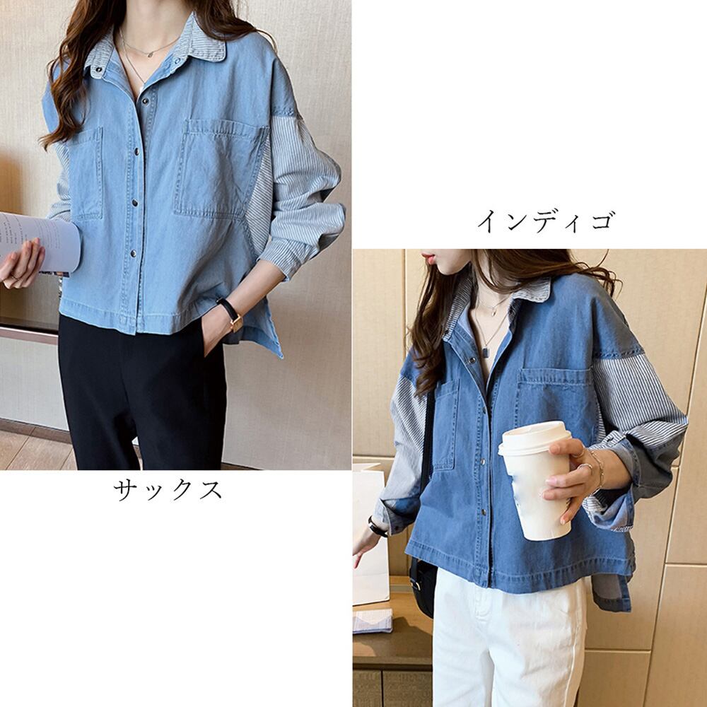 デニム風シャツ レディース 異素材切替 シャツブラウス カジュアル 長袖シャツ 春服 胸ポケット トップス 羽織り