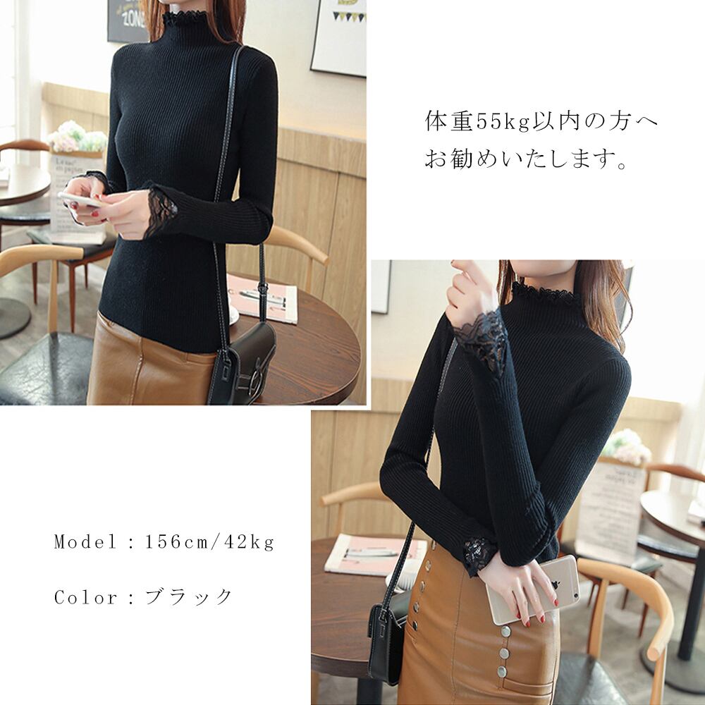 ハイネックで小顔効果を演出し、袖元のレースがポイントで一気に女性らしさを強調してくれます。