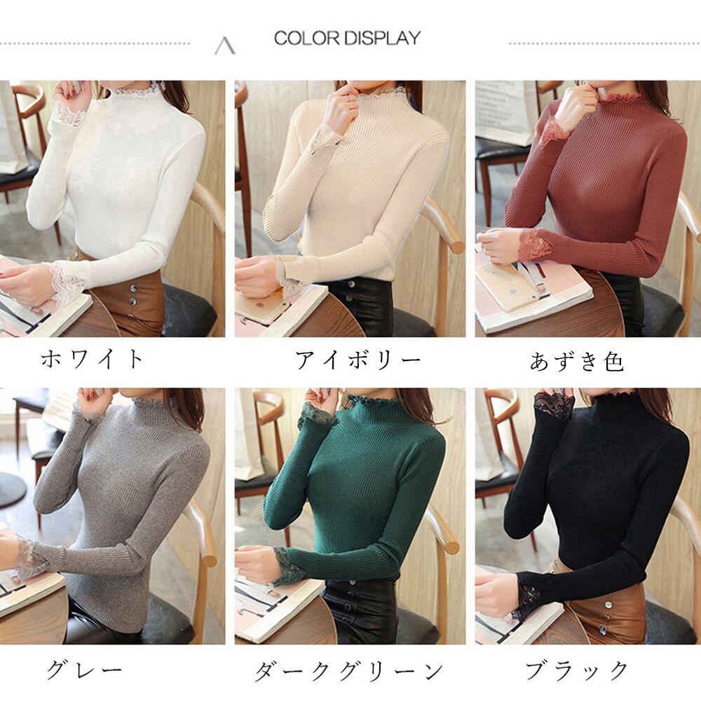 【日本倉庫即納】 リブニット トップス レディース ハイネック ニットセーター レースフリル襟