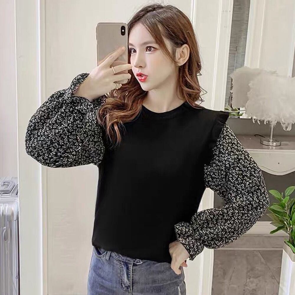 細かい花柄のボリュームある袖がドッキングしたニットプルオーバー
