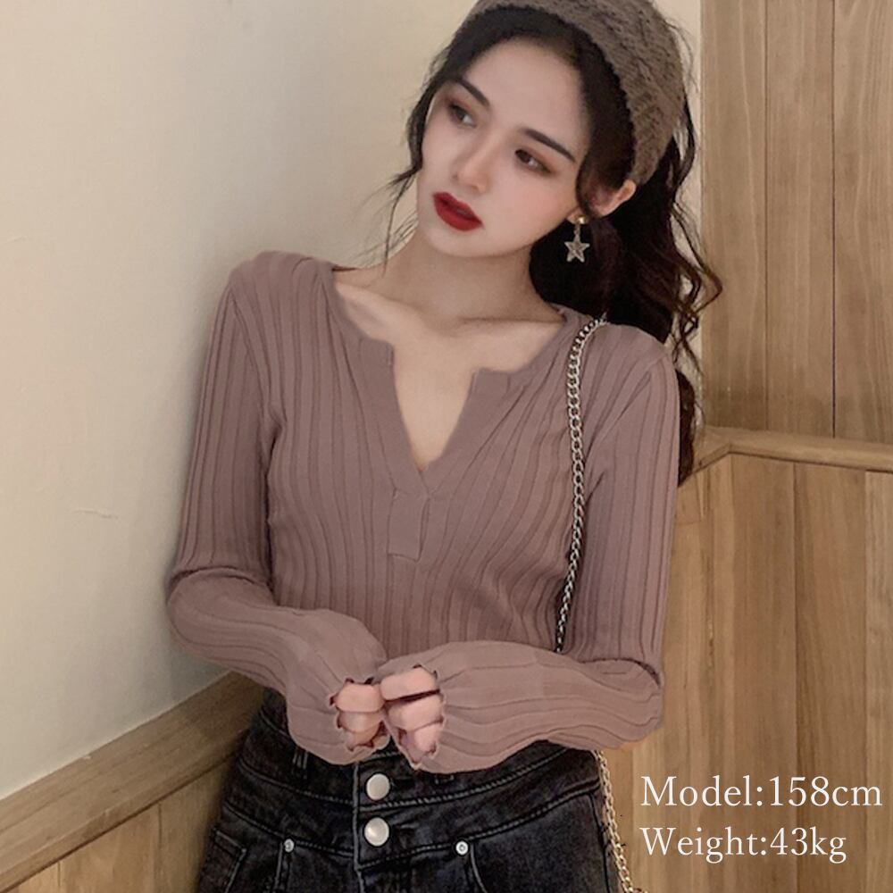 【日本倉庫即納】 ニットトップス Vネック 長袖 カットソー シンプル リブニット重ね着