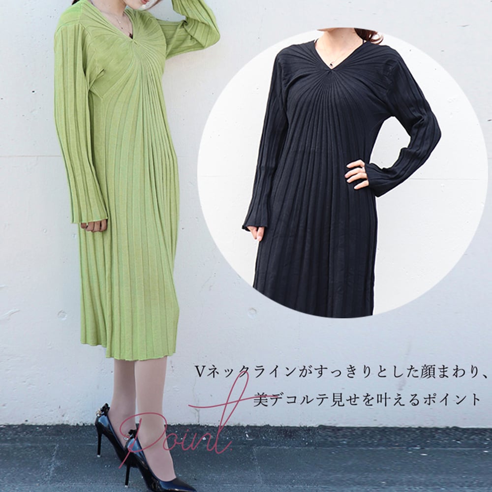 Vネック ワンピース レディース ニットワンピース 秋冬 長袖リブニット ミモレワンピ 膝丈下 フェミニン きれいめ