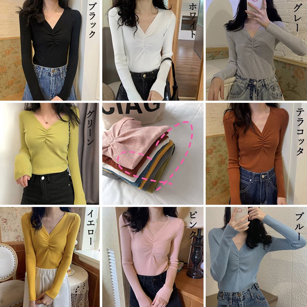【日本倉庫即納】 キャザー リブニット トップス レディース Vネック ニットカットソー 着やせ