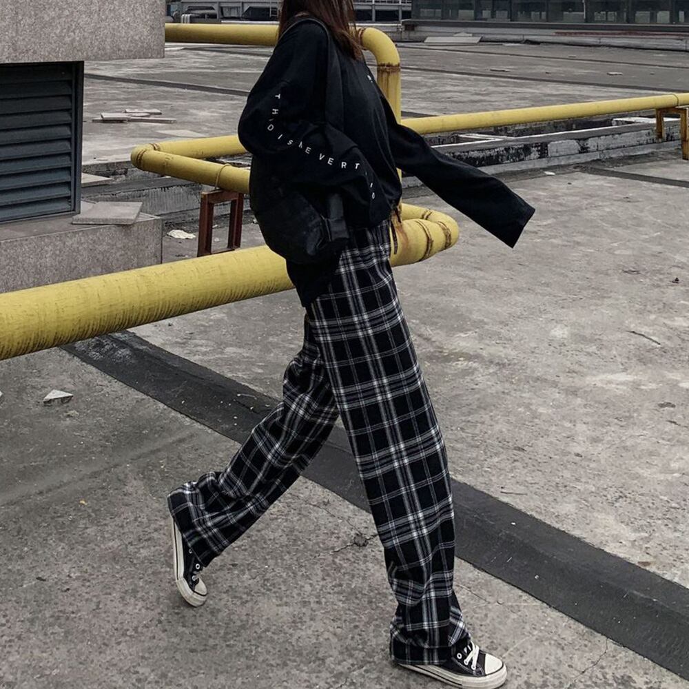 【日本倉庫即納】 チェック柄 ワイドパンツ レディース ハイウエスト ストレートパンツ ゆったり
