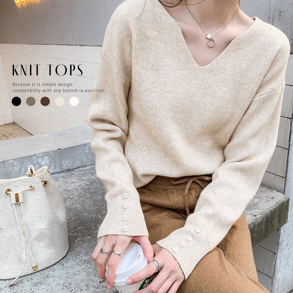 【日本倉庫即納】 ニットトップス レディース Vネック 長袖 ニットセーター 無地 ボタン飾り