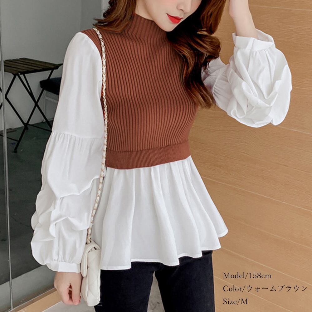 【日本倉庫即納】 ドッキング ニットブラウス レディース レイヤードニットソー 重ね着風