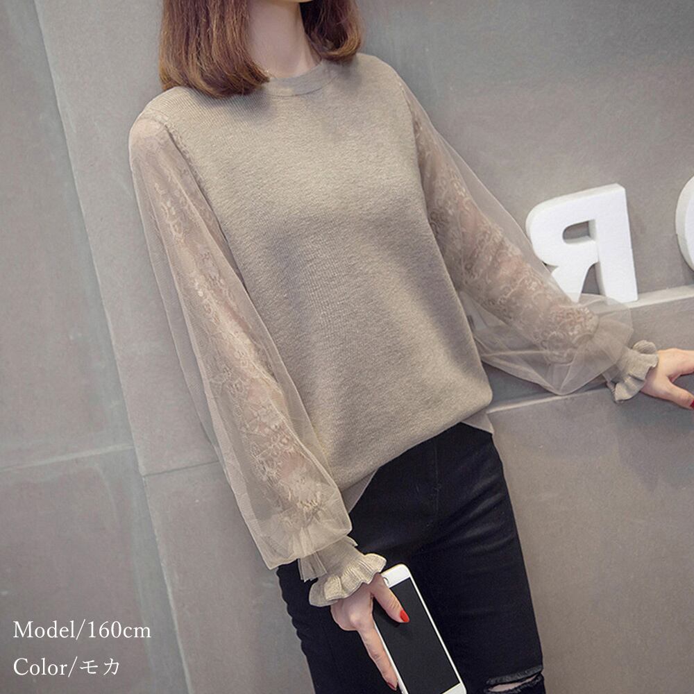 【日本倉庫即納】 長袖 ニットトップス レディース 袖チュール切り替え カットソー おしゃれ