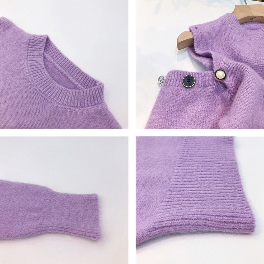 肩開き部分のボタンは開閉できるのでノーマルニットトップスとしても着用できる2way仕様、ご自分で開き具合を調節できてきちんと可愛いとフェミニンセクシーが選べる