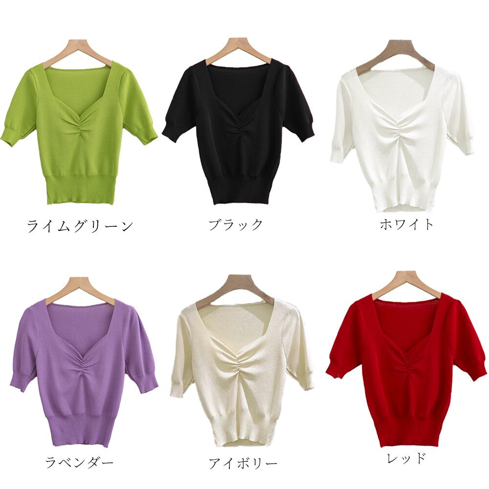 【日本倉庫即納】 Vネック ニットトップス レディース スクエアネック カットソー ギャザー