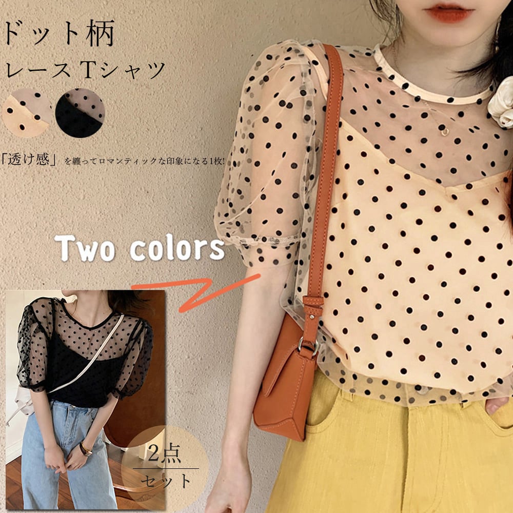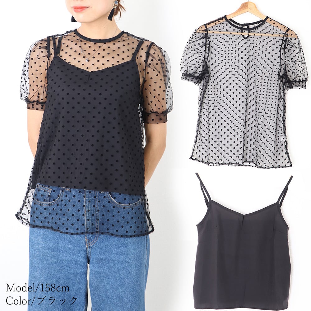 【日本倉庫即納】 ドット柄 シアーブラウス レディース キャミソール2点セット パフスリーブ