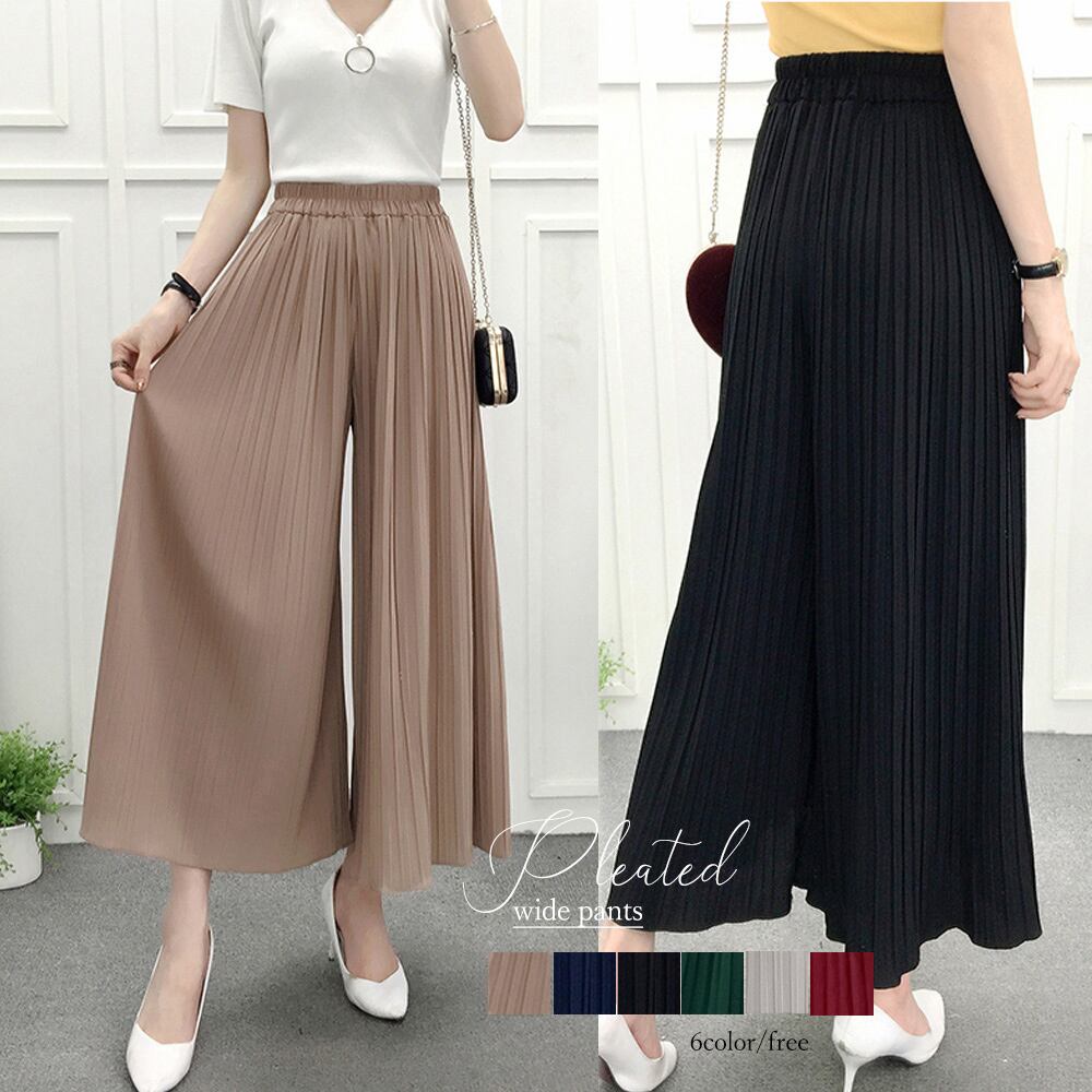 【日本倉庫即納】 プリーツ ガウチョパンツ レディース シフォン スカンツ ウエストゴム