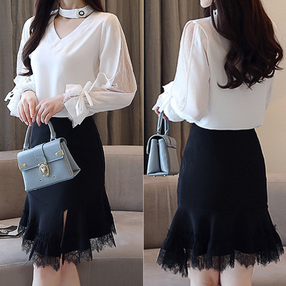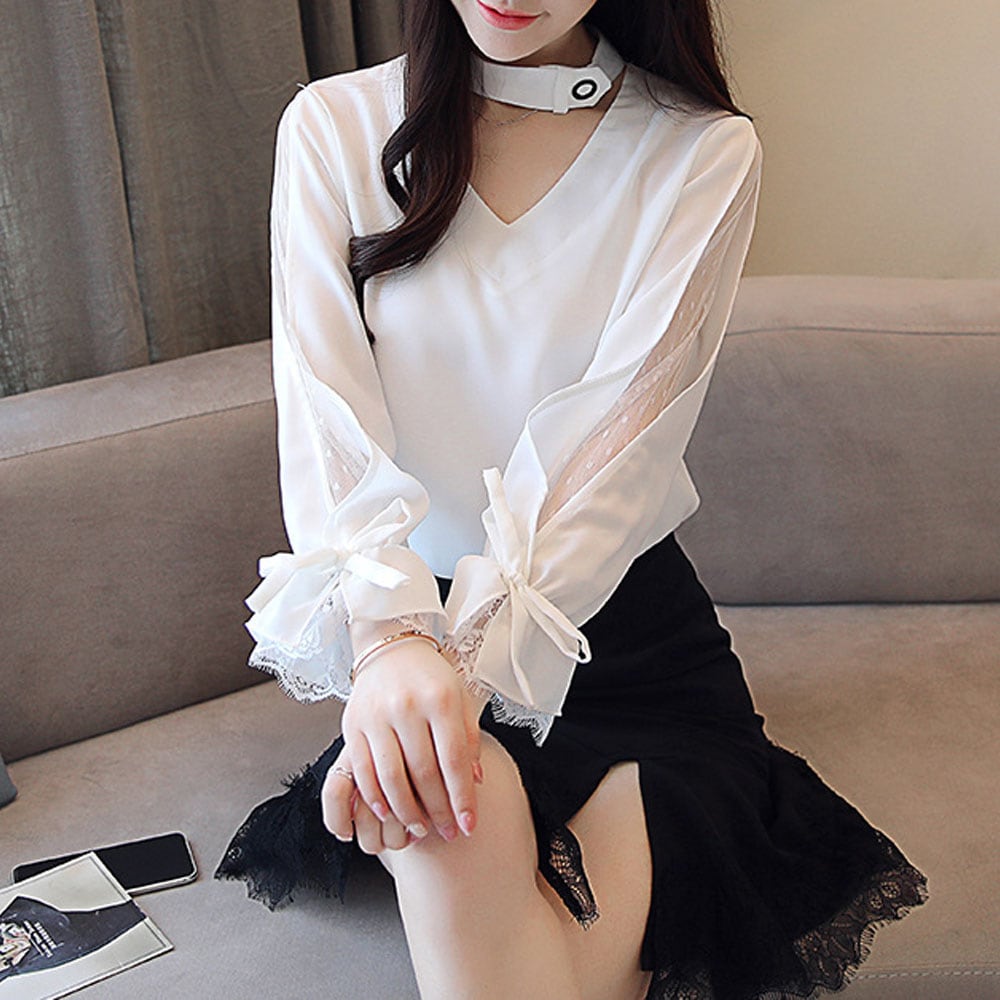 Vネックにチョーカー付き仕様のユニークなデザインの春夏向けシフォンブラウス