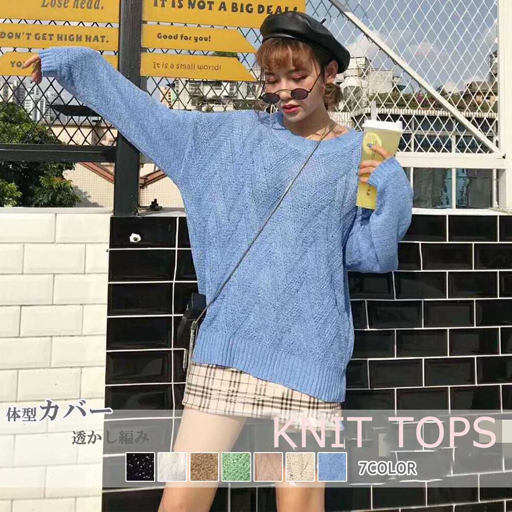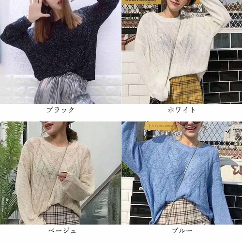 【日本倉庫即納】 ニットトップス レディース 薄手 ゆるニットセーター 透かし編み ロング丈